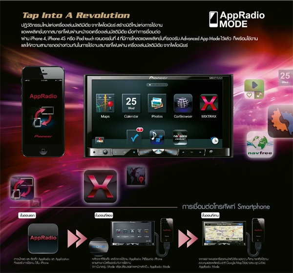 เครื่องเล่น AV Multi Media หน้าจอ 7 นิ้ว Full Motorized mode รองรับการเล่น แอพพลิเคชั่นผ่านหน้าจอ พัฒนาการ ใหม่จากไพโอเนียร์ได้สร้าง มิติใหม่ในการเล่นเครื่อง เอวี มัลติมีเดีย ที่พัฒนามาเพื่อการใช้งานกับสมาร์ทโฟนของผู้ขับขี่ได้ โดยเมื่อทำการต่อเชื่อมเครื่องเล่นเข้ากับ สมารท์โฟน อย่าง Appl หรือ Andriod ได้ หากมีการโหลดใช้งานแอพพลิเคชั่นที่รองรับ AppRadio MODE ไว้แล้ว จะพร้อมใช้งานร่วม และ ให้ความสามารถอย่างท่วมท้นในการใช้งานสมาร์ทโฟนในรถยนต์ผ่านจอภาพของเครื่องเล่น เอวี มัลติมีเดีย