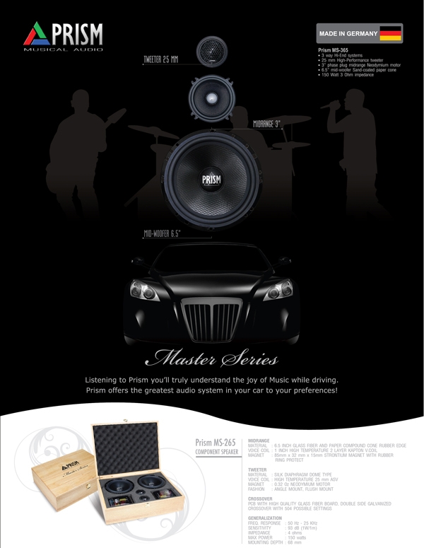 MASTER SERIES MS265 ชุดลำโพงแยกชิ้น 2 ทาง ดอกลำโพงเสียงกลางทุ้มขนาด 6.5 นิ้ว กรวยลำโพงผลิตด้วยกระดาษเสริมลวดลายเส้นใยธรรมชาติ ด้านบนเคลือบน้ำยาด้านล่างเผยเส้นใยกระดาษ ดัสแค็ปทรงนูนมีความนุ่ม ขอบเซอร์ราวด์ยางดิบคุณภาพดี วอยซ์คอยล์ทนความร้อนสูง โครงลำโพงโลหะขึ้นรูป ดอกเสียงแหลมโดมนิ่มขนาด 25 มิลลิเมตร แม่เหล็กนีโอไดเมียมน้ำหนัก 0.32 ออนซ์ วอยซ์คอยล์ ASV ขนาด 25 มิลลิเมตร ครอสโอเวอร์สามารถปรับแต่งได้ทั้งความลาดชันในการตัดความถี่ จุดตัดความถี่ทั้งเสียงทุ้มและเสียงแหลม ระดับปริมาณเสียงแหลมตอบสนองความถี่ 50 - 25,000 เฮิรตซ์ ความไว 93 ดีบี ความต้านทาน 3 โอห์ม รับกำลังขับปกติสูงสุด 150 วัตต์