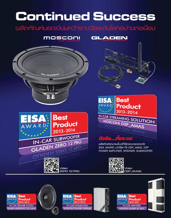 ที่สามารถกำหนดช่วงความถี่ที่ต้องการจะปรับเเต่งเสียงได้อย่างอิสระ ยกตัวอย่างเช่น หากต้องการปรับเเต่งเสียงในย่าน 67 HZ เเต่ไม่มีเเท่ง EQ ที่ตรงช่วงก็สามารถเข้าไปกำหนดให้เเท่ง EQ ที่อยู่ในช่วงที่ใกล้เคียงให้เป็นย่าน 67 HZ ได้เลย ซึ่งหากเป็น GRAPHIC EQUALIZER จะไม่สามารถกำหนดค่าได้ เช่นเดียวกับการปรับค่าในส่วนต่างๆ ที่ใช้ลักษณะเเละรูปเเบบการใส่ข้อมูลเช่น เดียวกันทั้งหมด ซึ่ง MOSCONI GRADEN DSP 6TO8 สามารถเข้าไปจัดการได้ทั้งหมด 6 ส่วนคือ MIXER PARA-GRAPHIC EQUALIZING CROSSOVER / FILTER TIME DELAY PHASE INVERSION เเละ LEVEL ด้วยรูปร่างหน้าตา ความสามารถในการปรับเเต่ง OPTION เสริมที่มีให้เล่นกันอย่างล้นเหลือ เเละการประมวลผลที่ค่อนข้างละเอียดตรงไปตรงมา รวมไปถึงน้ำเสียง ที่โปร่ง กระจ่าง ทำให้ MOSCONI GRADEN DSP 6TO8 ได้รับรางวัล BEST PRODUCT 2012-2013 จากสถาบัน EISA ด้าน IN-CAR INTEGRA-TION ซึ่งเป็นรางวัลจากสถาบันที่ผลิตภัณฑ์เครื่องเสียงชื่อดังทั่วโลกอยากได้มาครอบครองมากที่สุดสำหรับท่านที่สนใจ MOSCONI GRADER DSP 6TO8