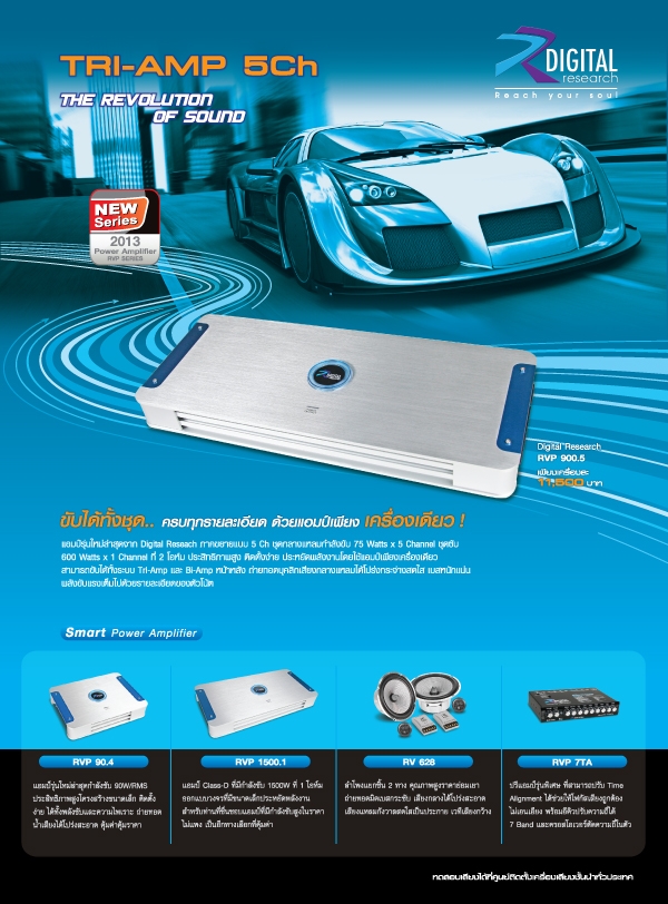 แอมป์รุ่นใหม่ล่าสุดจาก Digital Reseach ภาคขยายแบบ 5 Ch ชุดกลางแหลมกำลังขับ 75 Watts x 5 Channel ชุดซับ 600 Watts x 1 Channel ที่ 2 โอห์ม ประสิทธิภาพสูง ติดตั้งง่าย ประหยัดพลังงานโดยใช้แอมป์เพียงเครื่องเดียว สามารถขับได้ทั้งระบบ Tri-Amp และ Bi-Amp หน้าหลัง ถ่ายทอดบุคลิกเสียงกลางแหลมได้โปร่งกระจ่างสดใส เบสหนักแน่น พลังขับแรงเต็มไปด้วยรายละเอียดของตัวโน้ต