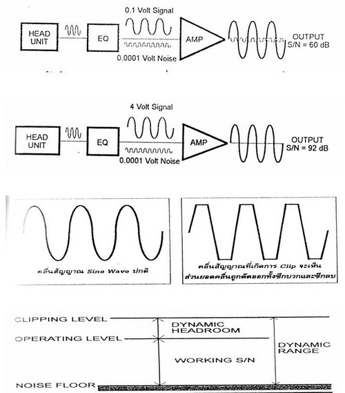 การทำให้ได้ค่า S/N: Signal to Noise Ratio ต้องเอาใจใส่ในเรื่องของการปรับระดับโวลท์เตจของสัญญาณขาเข้า(อินพุท)และขาออก(เอาท์พุท)ของอุปกรณ์แต่ละชิ้น โดยพิจารณาจากตัวอย่าง 2 ตัวอย่างที่จำลองมาจากระบบเสียงรถยนต์ทั่วๆไป ที่ประกอบด้วยแหล่งต้นเสียง(Head Unit), อีควอไลเซอร์(EQ) และเพาเวอร์แอมป์