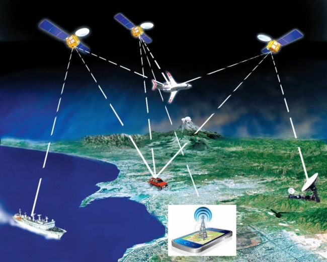 อาศัยตำแหน่งของดาวเทียมในอวกาศเป็นจุดอ้างอิง แล้ววัดระยะจากดาวเทียม 4 ดวง โดยใช้หลักการทางเรขาคณิตในการคำนวณหาตำแหน่งบนพื้นโลก