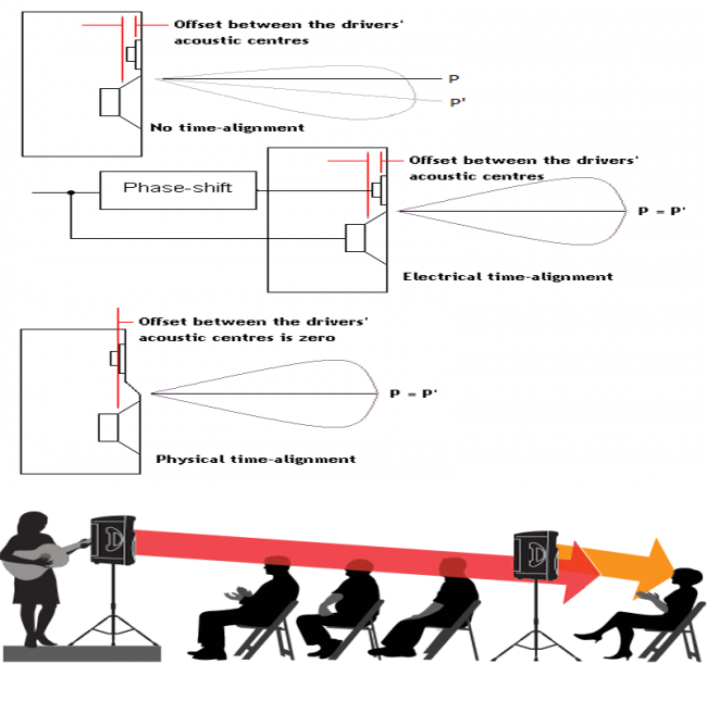 จากผลกระทบดังกล่าว จึงได้เริ่มมีงานออกแบบชุดลำโพง ที่มีการ Time Alignment หรือ “วางแนวเสียงให้ไปถึงที่หมายในเวลาเดียวกัน” ซึ่งมีขั้นตอนปฏิบัติอยู่ 2 แนวทางด้านกัน คือ การใช้อุปกรณ์ในหมวด Phase-Shift เพื่อทอนเวลาเดินทางของแถบเสียงที่มีความยาวคลื่นน้อยกว่า และการออกแบบโครงสร้าง เพื่อติดตั้งแนวแกนของทวีตเตอร์ให้ตรงกับแนวแกนของวูฟเฟอร์