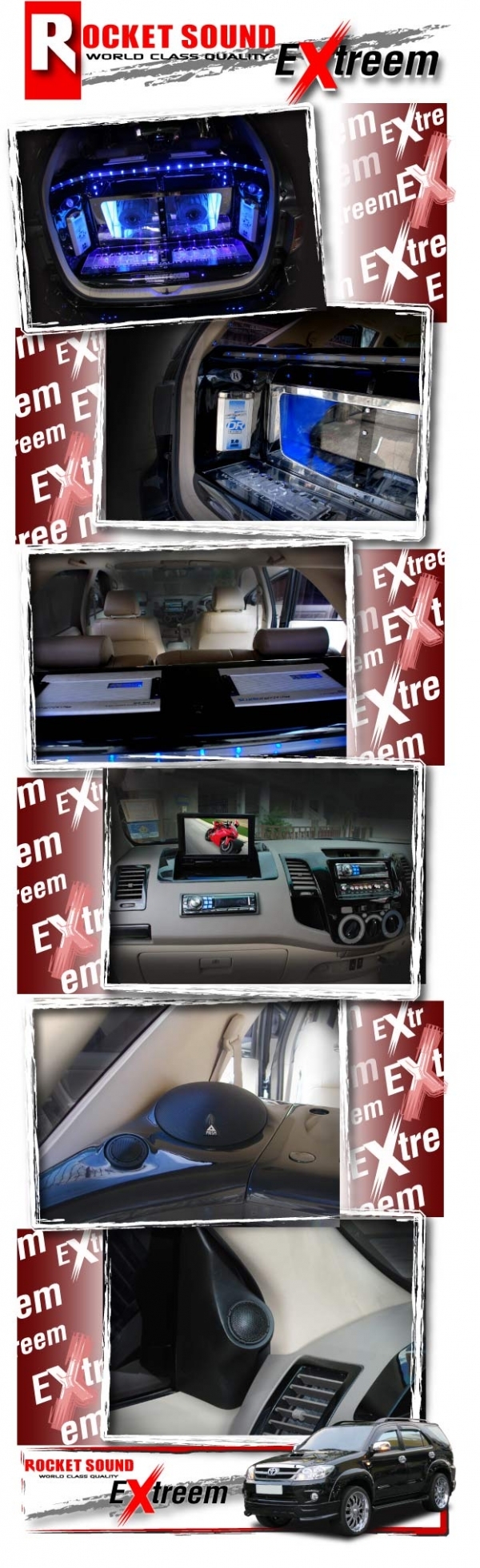 หนึ่งในบรรดาขีดสุดของ Toyota Fortuner ต้องยกให้คันนี้ ที่”ร็อคเก็ตซาวด์”คิดสรรค์ชิ้นงานได้สวยสะดุดตา คงคุณค่าแห่งสีสัน และตู้เบสสูตรพิเศษเบสอลังการ จากการทำงานของซับ CerwinVega Stroker โดยมีแอมป์จ้าวพลังอย่าง Prism รับหน้าที่ส่งเสบียงเสียงมหึมา เพื่อเสริมบรรยากาศการฟังให้ได้มันส์อย่างที่ต้องการ ที่สำคัญ CAP ของ Digital Research 2F x 2 ที่สำรองไฟได้อย่างไม่บกพร่องทุกระดับ dB นอกเหนือจากสำเนียงเสียงกลางแหลมคุณภาพจาก Prism แน่นอนครับท่าน...คันนี้
