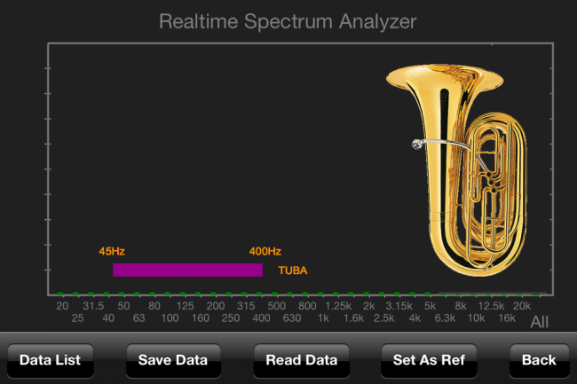 TUBA Frequency Range แถบช่วงคลื่นเสียงของเครื่องดนตรีชนิดเป่า ที่เรียกว่า TUBA (ทูบา) จะเกิดขึ้นตั้งแต่ประมาณ 45Hz เรื่อยไปจนถึงราวๆ 400Hz ซึ่งจะทำให้มีเสียงปรากฏอยู่ทั้งในส่วนของซับวูฟเฟอร์ และตัวขับเสียงมิดเบส