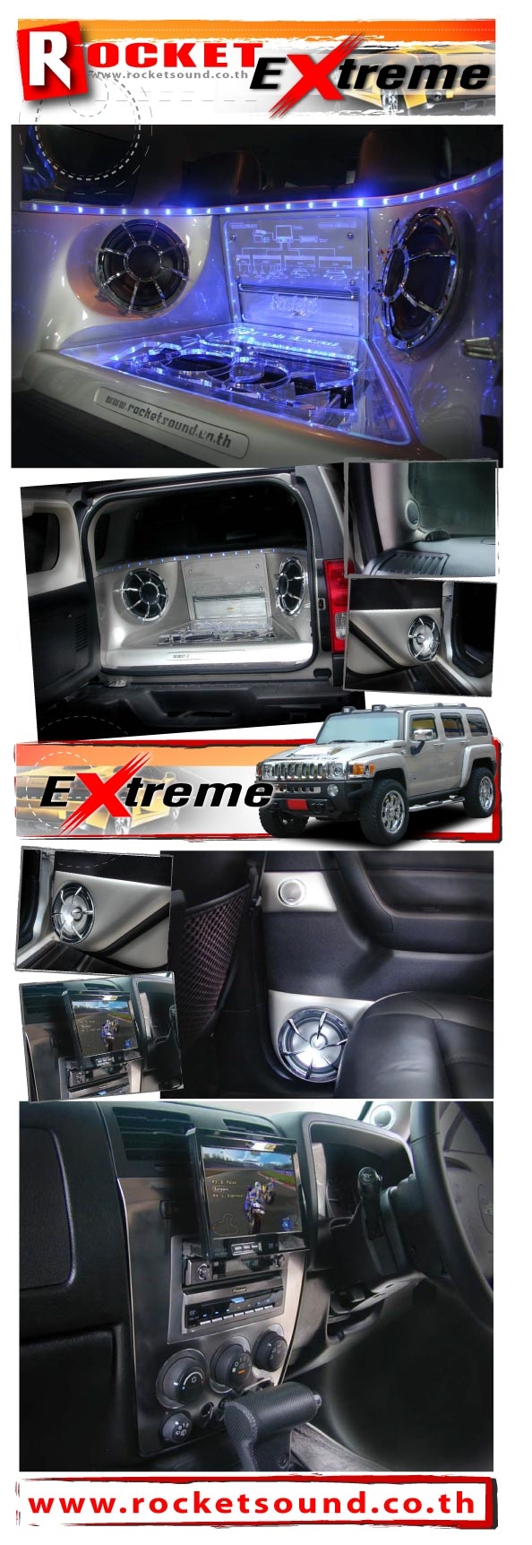 ที่สุดของงานติดตั้ง HAMMER H3 คันนี้ อยู่ที่ชิ้นงานส่วนท้ายรถ อันเป็นบริเวณของการจัดวางซับวูฟเฟอร์, เพาเวอร์แอมป์ และอุปกรณ์เสริมต่างๆ ที่วางรูปแบบงานอันวิจิตร-บรรจง ด้วยส่วนประกอบของแผ่นใสและไฟสีฟ้านวล โดยไม่ละเลยกับการออกแบบตู้ซับฯที่ตรงสูตร เพื่อผลของเสียงเบสที่ถูกต้องในทุกๆกรณีของการฟัง พร้อมทั้งความงามสง่าเมื่อเปิดเผยส่วนท้าย ที่ใครได้เห็นก็ต่างชื่มชมในประดิษฐกรรมที่ต้องการให้เป็น”มาสเตอร์พีช”ชิ้นนี้ สร้างความภาคภูมิใจให้กับเจ้าของระบบในขั้น”สุดขีด”