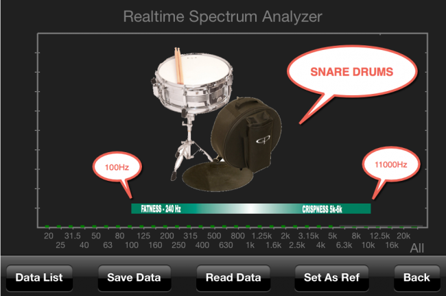 SNARE DRUMS Frequency Range แถบช่วงคลื่นเสียงของเครื่องดนตรีเคาะ ที่รวมอยู่ในกลุ่มกลองชุด เรียกกันว่า SNARE DRUMS (สแนร์ ดรัม) หรือ กลองสแนร์ ให้จุดเริ่มต้นของเสียงที่ประมาณ 100Hz ขึ้นไปถึงประมาณ 11000Hz ซึ่งจะเริ่มมีเสียงปรากฏอยู่ในส่วนของตัวขับมิดเบส, ตัวขับมิดเรนจ์ เรื่อยไปจนถึงในตัวขับทวีตเตอร์