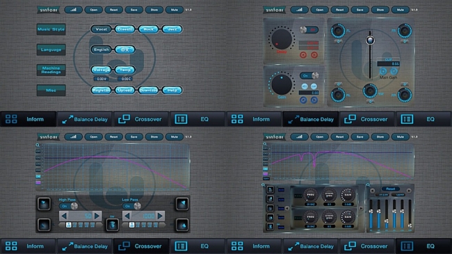 SINFONI DSP แอปที่ใช้เพื่อควบคุมการปรับตั้งโปรเซสเซอร์ 6 แชนแนล ผ่าน iPhone/iPad ได้ทั้งการตัดช่วงความถี่ (Cross high/low pass), การปรับตั้งอีควอไลเซอร์ (EQ), การปรับตั้งเกนขยาย (gain), การปรับตั้งระยะหน่วงเสียง (delay) และอื่นๆ