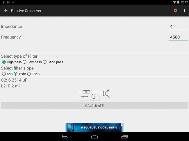 Crossover Calculator App เป็นแอปบนอุปกรณ์-แอนดรอย ใช้ในการคำนวณค่าของอุปกรณ์บนวงจร “พาสซีฟ-ครอสโอเวอร์”และงานอื่นๆ