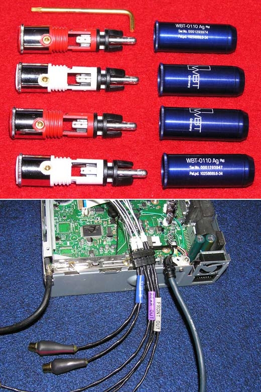 ฟร้อน์ อุปกรณ์ชิ้นนี้ส่วนใหญ่จะโมฯกันที่สายด้านหลังเครื่อง เพราะสายที่ให้มาจากโรงงานมีคุณภาพระดับหนึ่ง เมื่อเปลี่ยนสายใหม่ก็เลือกได้ตามใจว่าจะใส่สายที่ทำจากวัสดุอะไร เพื่อให้เกิดเสียงเป็นอย่างไร เชนสายเงินแท้ให้รายละเอียดเสียงแหลมที่ดี มีความหวาน สายทองแดงบริสุทธิ์มีเนื้อเสียงทุ้มที่เข้มข้น ต่อมาคือขั้วแจ็คแบบอาร์ซีเอ ขั้วประเภทนี้ทางผู้ผลิตมักไม่ให้ความสำคัญมากนัก ส่วนใหญ่เป็นนิเกิ้ลธรรมดา นักเล่นบางคนอาจจะเปลี่ยนใส่ขั้วอาร์ซีเอคุณภาพสูง เช่น WBT ที่ผลิตด้วยทองแดงคุณภาพสูงเคลือบด้วยทองคำ 24 เค แน่นอนครับว่าสวยงามขึ้นและทนทานขึ้น เนื่องจากอ๊อกไซค์หรือคราบสนิมในขั้วคุณภาพสูงนั้นเกิดได้ยาก แล้วคุณภาพเสียงจะเปลี่ยนไปอย่างไร ก็ขึ้นอยู่กับเทคนิกของผู้โมฯแต่ละสำนักเป็นสำคัญ
