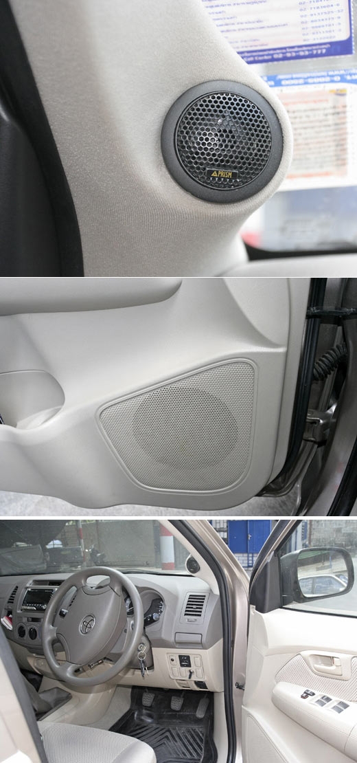 มาต่อกันที่การติดตั้งลำโพง ซึ่งนับว่าเป็นหัวใจและเคล็ดลับของชุดเครื่องเสียงภายในรถคันนี้ครับ ลำโพงติดตั้งที่ประตูหน้าเพียงคู่เดียวเท่านั้น ใช้แผ่นไม่หนาเสริมการติดตั้งเพื่อให้มีความแข็งแรง และใช้แผ่นแดมป์คุณภาพดีที่จะไม่เหนียวเป็นช็อกโกแล็ตละลายเมื่อเจอความร้อนสูง แดมป์ประตูทั้งบาน ช่วยให้ช่องภายในประตูเป็นเสมือนตู้ลำโพง ช่วยเพิ่มแรงอัดของเสียงทุ้มให้มีปริมาณเพิ่มขึ้นอีกมาก ทั้งยังช่วยให้ภายในรถเงียบขึ้นอีกด้วย คันนี้แดมป์ประตูหน้าและประตูหลังครับ