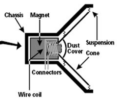 กระแสสลับที่ไหลผ่านเข้าไปในสนามแม่เหล็ก เกิดปฎิกริยาทำให้กลุ่มขดลวดมีการเคลื่อนที่ มีผลให้กรวย(หรือไดอาแฟรม)มีการขยับตัวตามไปด้วย ในลักษณะของการผลักไปด้านหน้าและดึงกลับมาด้านหลังสลับไป-มาจนทำให้เกิด”เสียง”
