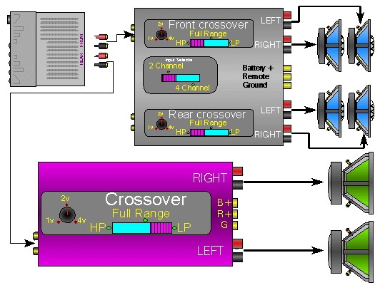ภาพลักษณ์ของระบบ 2 ทางในเชิงพาณิชย์ทั่วไป ก็คือ ลำโพงมิดวูฟเฟอร์และทวีตเตอร์ ถูกขับด้วยเพาเวอร์แอมป์ขนาดกำลังขับประมาณ 60 วัตต์ x 2 เมื่อเราป้อนสัญญาณเพื่อการฟังปกติมันอาจดูเหมือนไม่มีอะไรผิดปกติ แต่เมื่อเราเพิ่มปริมาณความดังเสียงให้มากขึ้นจากเดิม ไปจนถึงระดับที่เพาเวอร์แอมป์มีการคลิปยอดสัญญาณ อันหมายถึงความต้องการทางพลังเสียงดนตรีนั้นอยู่เหนือขีดความสามารถที่ระบบจะตอบสนองได้ โดยเฉพาะอย่างยิ่งกับความถี่ในระดับที่ต่ำกว่า 90 Hz ลงไป ความไพเราะที่ควรจะมีก็ถูกถอดถอนออกไปจนเหลือแต่ความหนวกหู