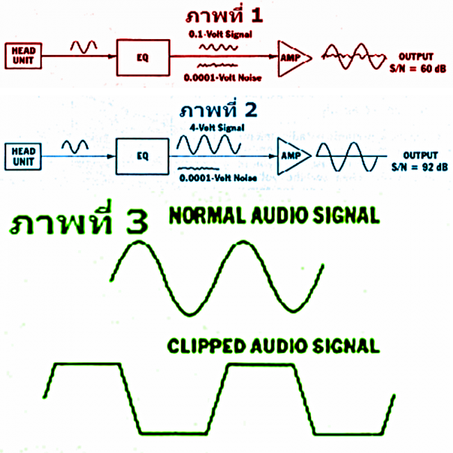 ก่อนอื่น เราไปดูภาพที่ 1 กันก่อน โดยในภาพนี้ จะสังเกตเห็นได้ว่า ระดับของสัญญาณเสียงหรือแรงดันเสียงที่ป้อนเข้าไปในเพาเวอร์แอมป์นั้น มีค่าเป็น 0.1 โวลต์ RMS ในขณะที่แรงดันเสียงของสัญญาณรบกวนอยู่ที่ 0.0001 โวลต์ RMS