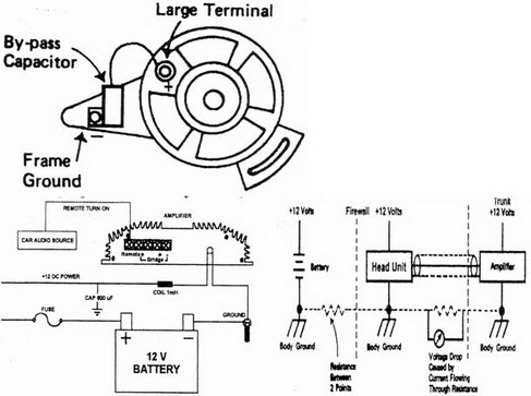ข้อแนะนำ: พยายามวางตัวคาปาซิเตอร์ให้อยู่ใกล้ตัวปั่นไฟมากที่สุด และจุดที่ต่อลงกราวน์(ตัวถังรถ)นั้นจะต้องสะอาดที่สุด หากมีสีหรือความสกปรกอยู่ ให้ทำการขัดออกจนเห็นเนื้อตัวถังรถที่เป็นโลหะ เพื่อให้มีค่าความต้านทานน้อยที่สุด หากมี VOM ก็ให้ทำการวัดค่าความต้านทานระหว่างตัวคาปาซิเตอร์กับจุดที่ต่อลงกราวน์นั้น โดยจะต้องมีค่าความต้านทานกว่า 0.3 โอห์ม